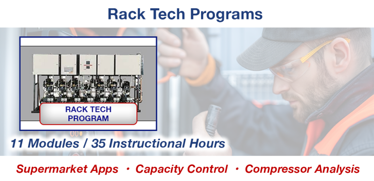 The Rack Tech Program is an advanced program totaling 35 instructional hours. Students will take one course at a time in a systematic progression that moves through market refrigeration and the specific technologies focusing on Parallel and Unparallel Rack Systems and Applications as well as video demonstrations of compressor teardowns.